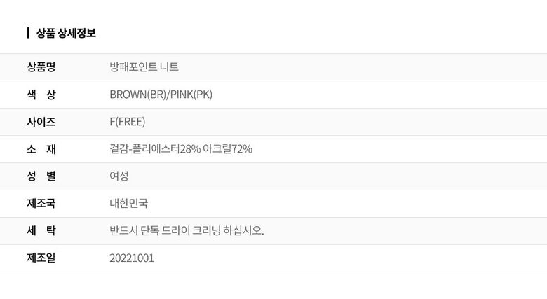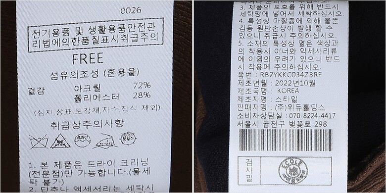 1. 제품 소재 (섬유의 조성 또는 혼용률을 백분율로 표시, 기능성인 경우 성적서 또는 허가서) 겉감-폴리에스터28% 아크릴72%