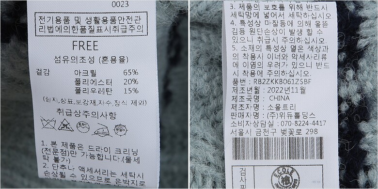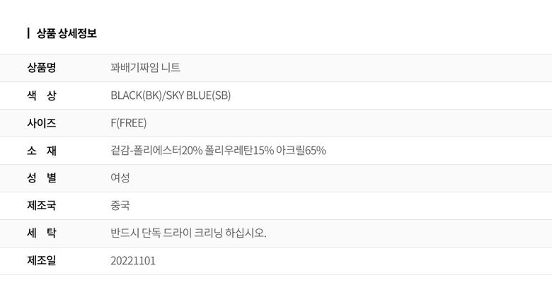 | 1. 제품 소재 (섬유의 조성 또는 혼용률을 백분율로 표시, 기능성인 경우 성적서 또는 허가서) | 겉감-폴리에스터20% 폴리우레탄15% 아크릴65% |
