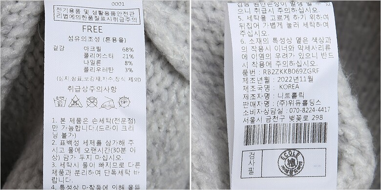 | 1. 제품 소재 (섬유의 조성 또는 혼용률을 백분율로 표시, 기능성인 경우 성적서 또는 허가서) | 겉감-폴리에스터21% 폴리우레탄3% 나일론8% 아크릴68% |