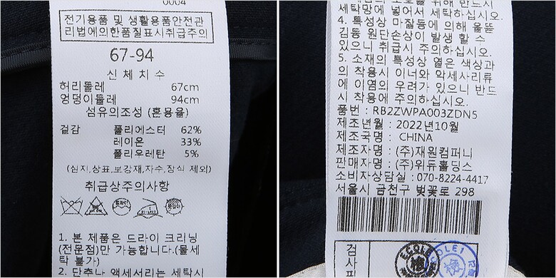 | 1. 제품 소재 (섬유의 조성 또는 혼용률을 백분율로 표시, 기능성인 경우 성적서 또는 허가서) | 겉감-폴리에스터62% 폴리우레탄5% 레이온33% |
