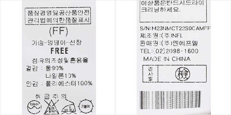 | 1. 제품 소재 (섬유의 조성 또는 혼용률을 백분율로 표시, 기능성인 경우 성적서 또는 허가서) | 겉감-나일론10% 울90% 안감-폴리에스터100% |