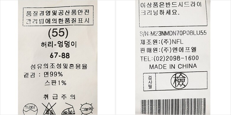 | 1. 제품 소재 (섬유의 조성 또는 혼용률을 백분율로 표시, 기능성인 경우 성적서 또는 허가서) | 겉감-면99% 스판1% |