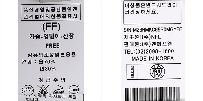 | 1. 제품 소재 (섬유의 조성 또는 혼용률을 백분율로 표시, 기능성인 경우 성적서 또는 허가서) | 겉감-면30% 울70% |