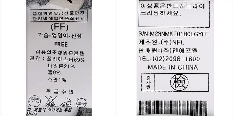 1. 제품 소재 (섬유의 조성 또는 혼용률을 백분율로 표시, 기능성인 경우 성적서 또는 허가서) | 겉감-폴리에스터69% 나일론21% 울9% 스판1% |