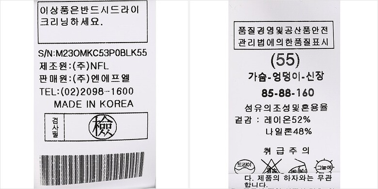 1. 제품 소재 (섬유의 조성 또는 혼용률을 백분율로 표시, 기능성인 경우 성적서 또는 허가서) | 겉감-나일론48% 레이온52% |