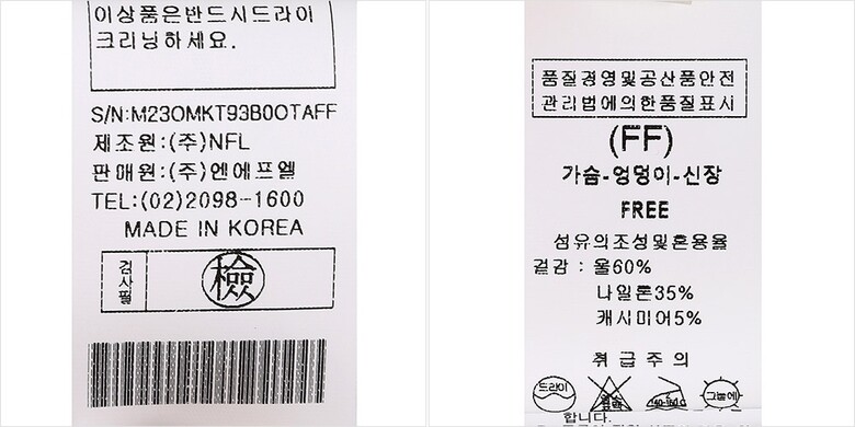 | 1. 제품 소재 (섬유의 조성 또는 혼용률을 백분율로 표시, 기능성인 경우 성적서 또는 허가서) | 겉감-나일론35% 울60% 캐시미어5% |