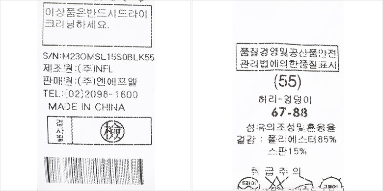 | 1. 제품 소재 (섬유의 조성 또는 혼용률을 백분율로 표시, 기능성인 경우 성적서 또는 허가서) | 겉감-폴리에스터85% 스판15% |