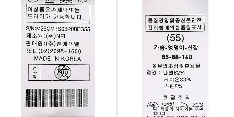 | 1. 제품 소재 (섬유의 조성 또는 혼용률을 백분율로 표시, 기능성인 경우 성적서 또는 허가서) | 겉감-텐셀62% 레이온33% 스판5% |