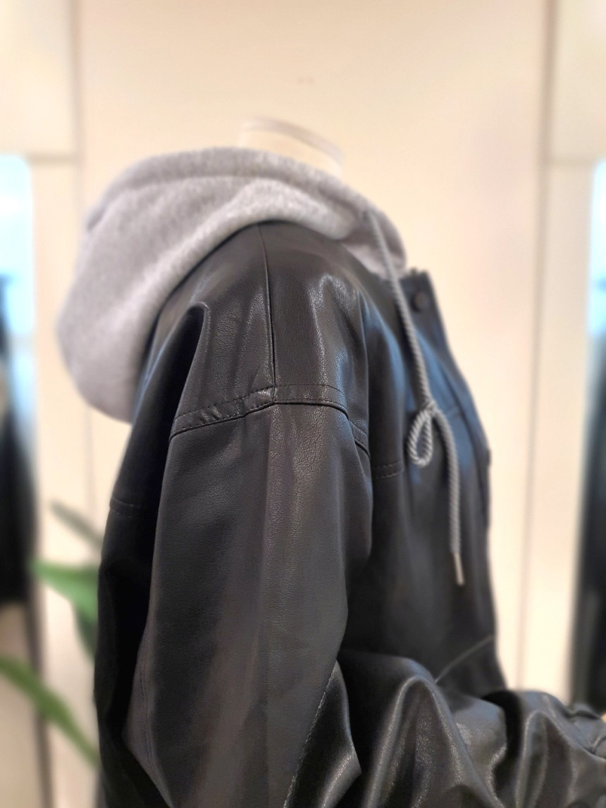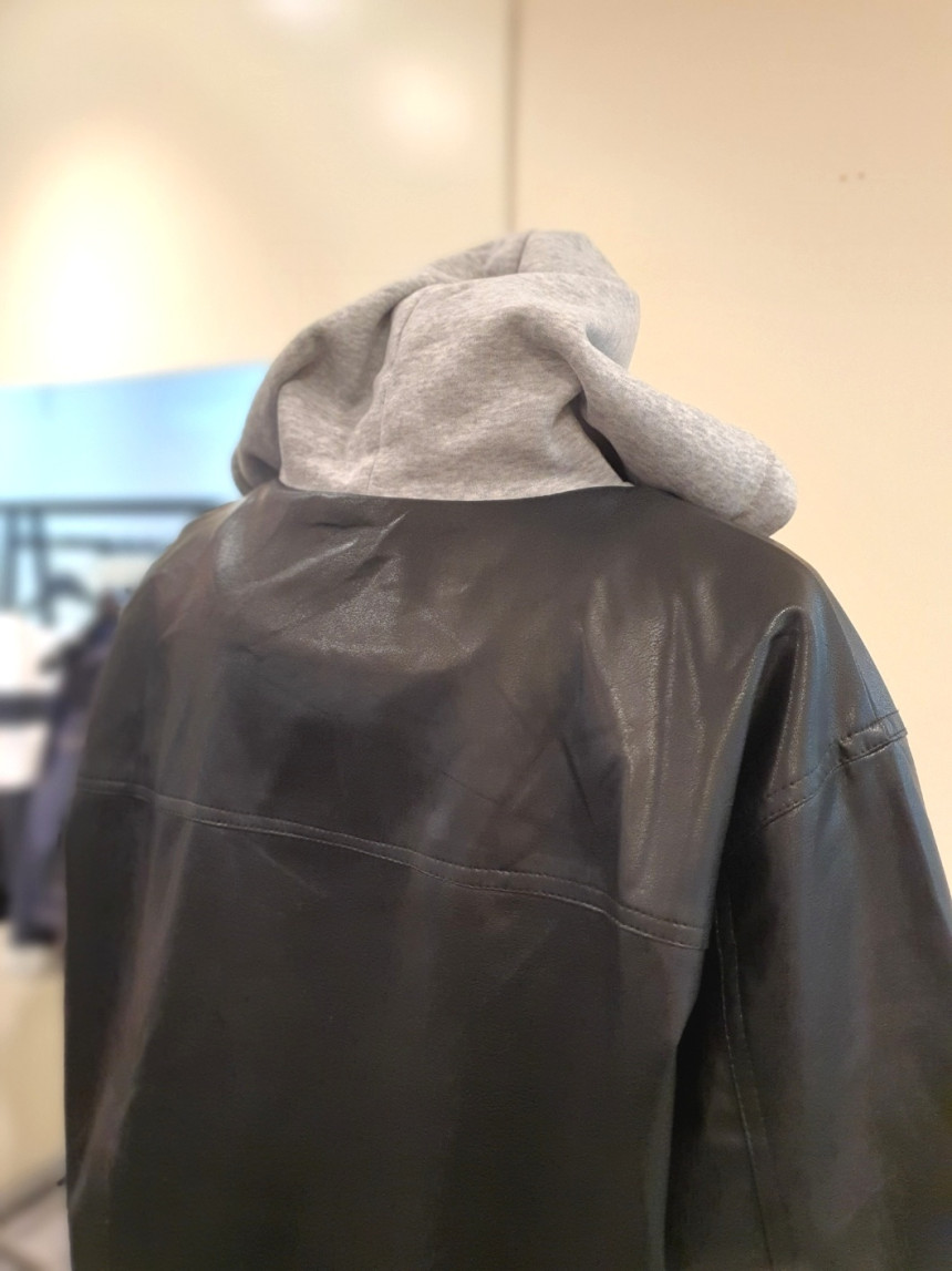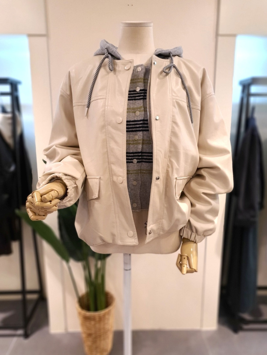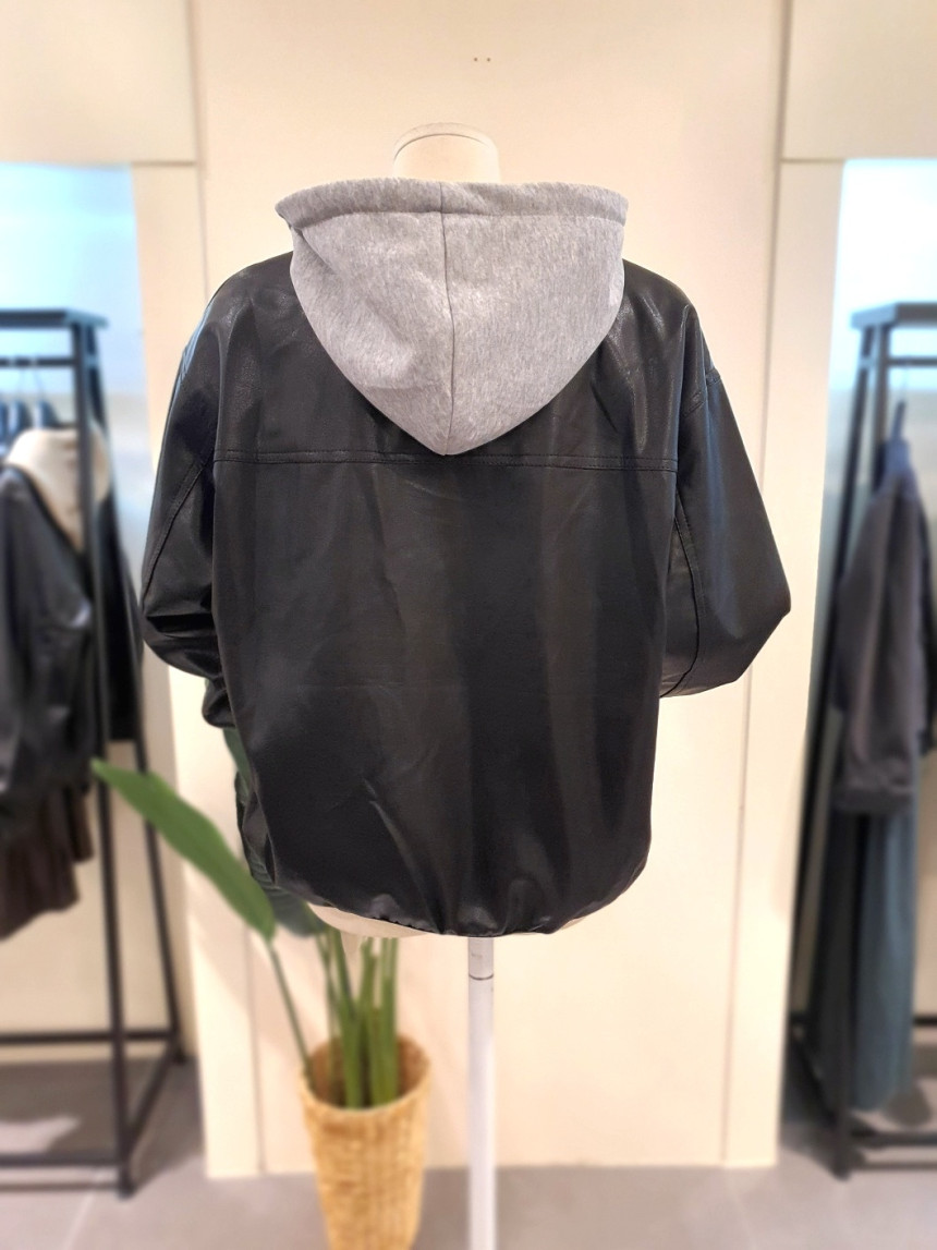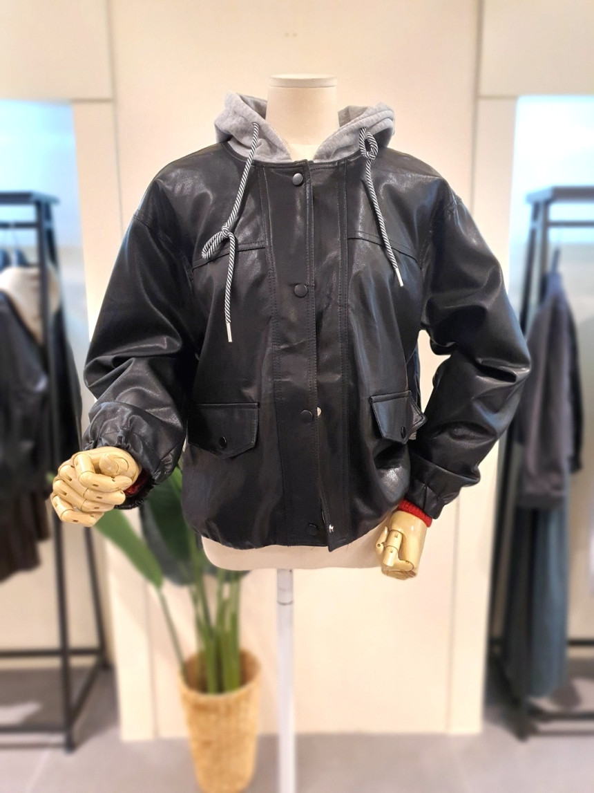 집업 후드 에코 가죽 점퍼입니다. 부드럽고 가벼운 무게감으로 부담없이 착용하기 좋습니다.