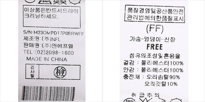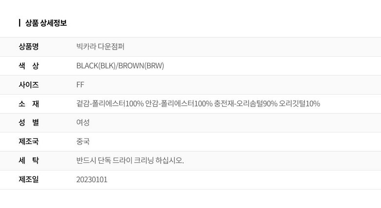 | 1. 제품 소재 (섬유의 조성 또는 혼용률을 백분율로 표시, 기능성인 경우 성적서 또는 허가서) | 겉감-폴리에스터100% 안감-폴리에스터100% 충전재-오리솜털90% 오리깃털10% |