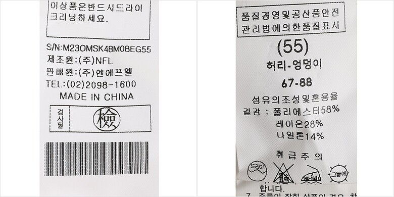 | 1. 제품 소재 (섬유의 조성 또는 혼용률을 백분율로 표시, 기능성인 경우 성적서 또는 허가서) | 겉감-폴리에스터58% 나일론14% 레이온28% |