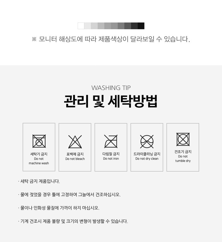 • 처음 배송된 상품상태와 다를 경우(세탁/착용 후 외출하신 경우) 반품이 불가합니다.