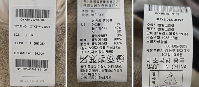 겉감:아크릴51%폴리에스터40%모6%폴리우레탄3%,배색:폴리에스터100%,충전재:폴리에스터100%