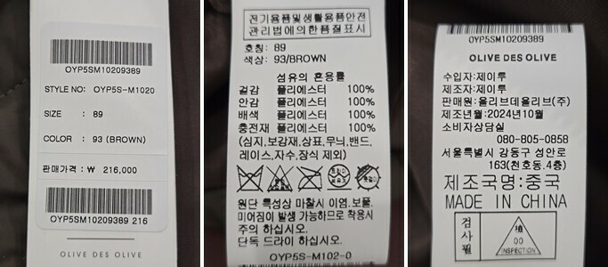 | 1. 제품 소재 (섬유의 조성 또는 혼용률을 백분율로 표시, 기능성인 경우 성적서 또는 허가서) | 겉감:폴리에스터100%,안감:폴리에스터100%,배색:폴리에스터100%,충전 |