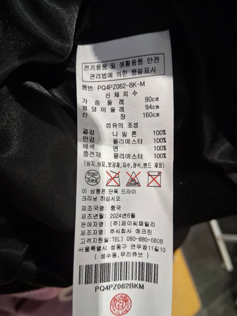 | 1. 제품 소재 (섬유의 조성 또는 혼용률을 백분율로 표시, 기능성인 경우 성적서 또는 허가서) | 겉감:나일론 100% / 안감:폴리에스테르 100% / 배색:면 100% / 충전 |