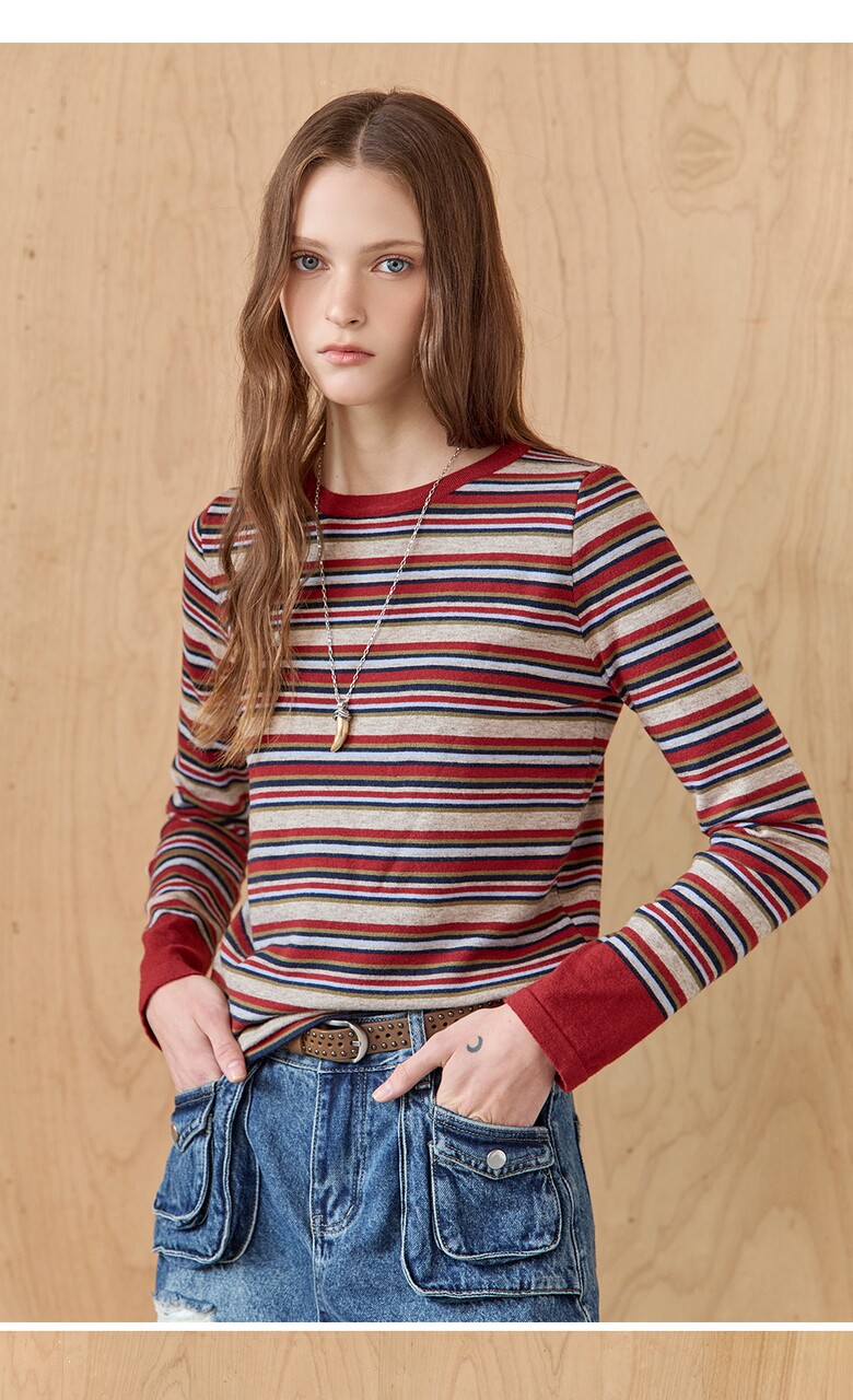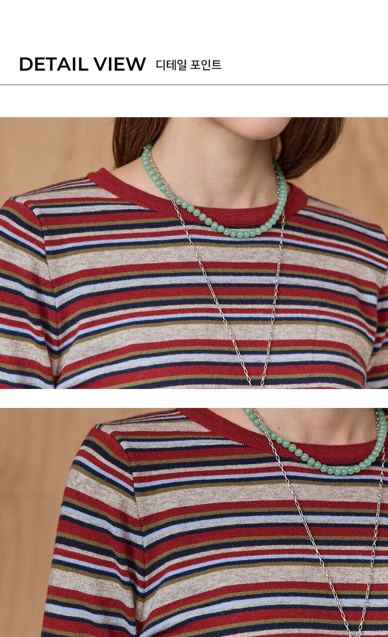 스트라이프 패턴이 돋보이는 라운드넥 니트입니다.