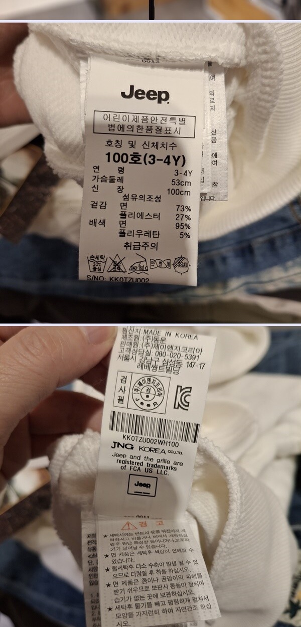 1. 제품 소재 (섬유의 조성 또는 혼용률을 백분율로 표시, 기능성인 경우 성적서 또는 허가서) | 겉감-면73%, 폴리에스터27% 배색-면95%, 폴리우레탄5% |