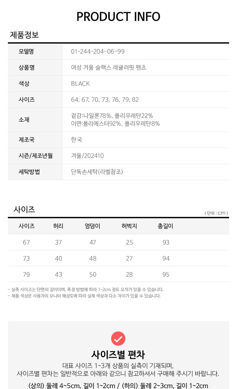 3. 치수 67사이즈기준실측 : 허리37cm, 엉덩이47cm, 허벅지25cm, 총길이93cm