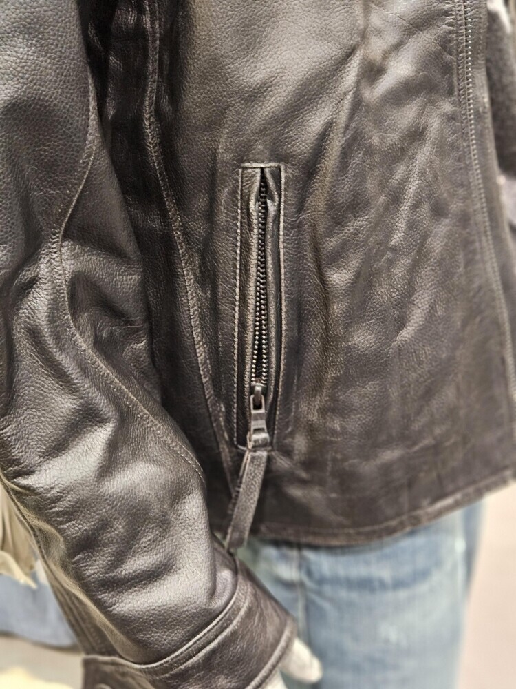 금속 지퍼를 사용하여 시크한 포인트를 주었으며 소매에 곡선 절개와 스티치 디테일을 사용하여 포인트를 줌
