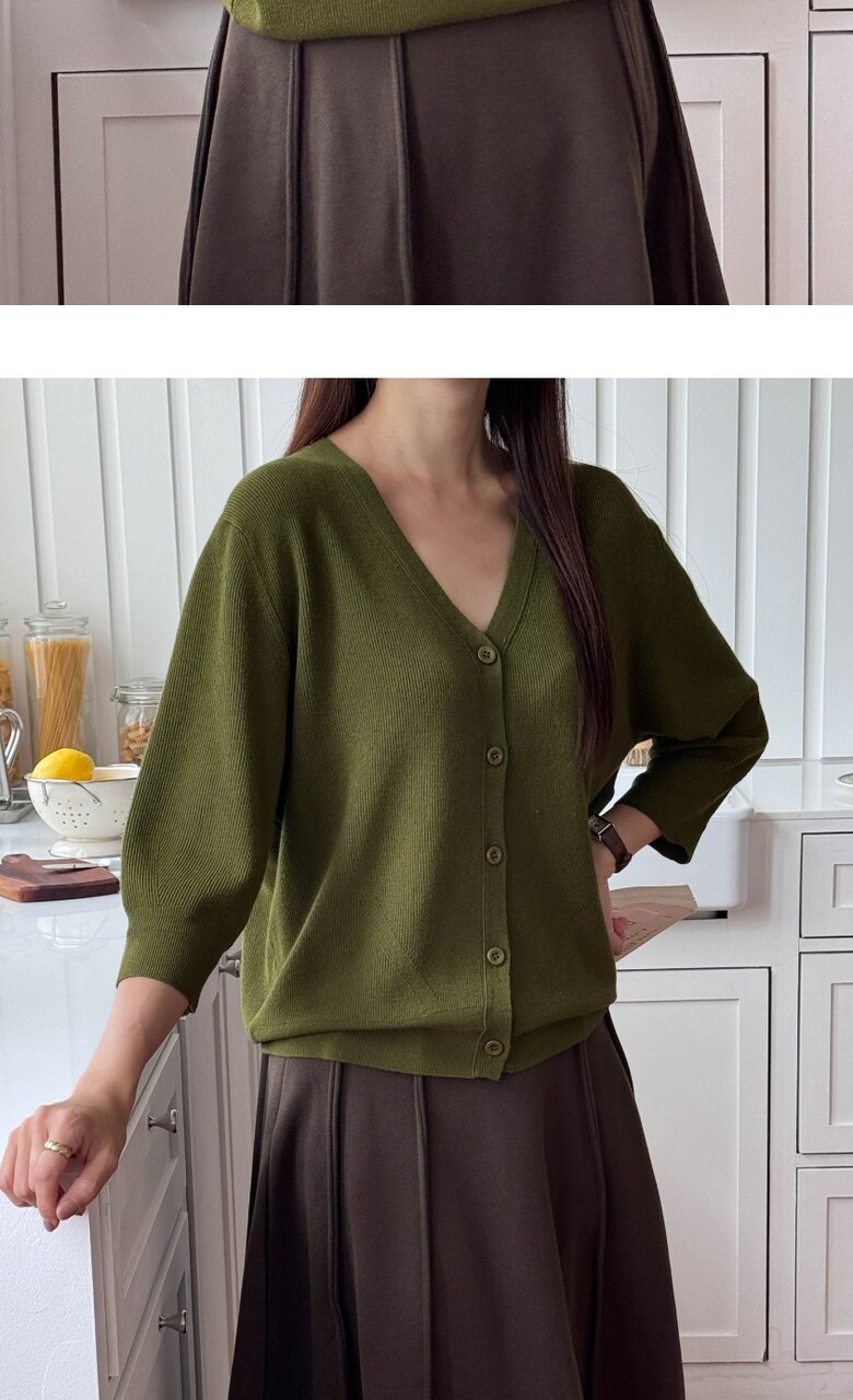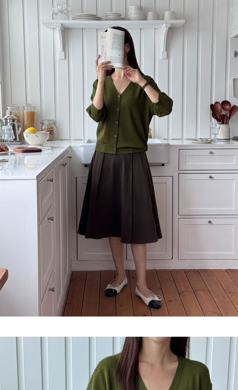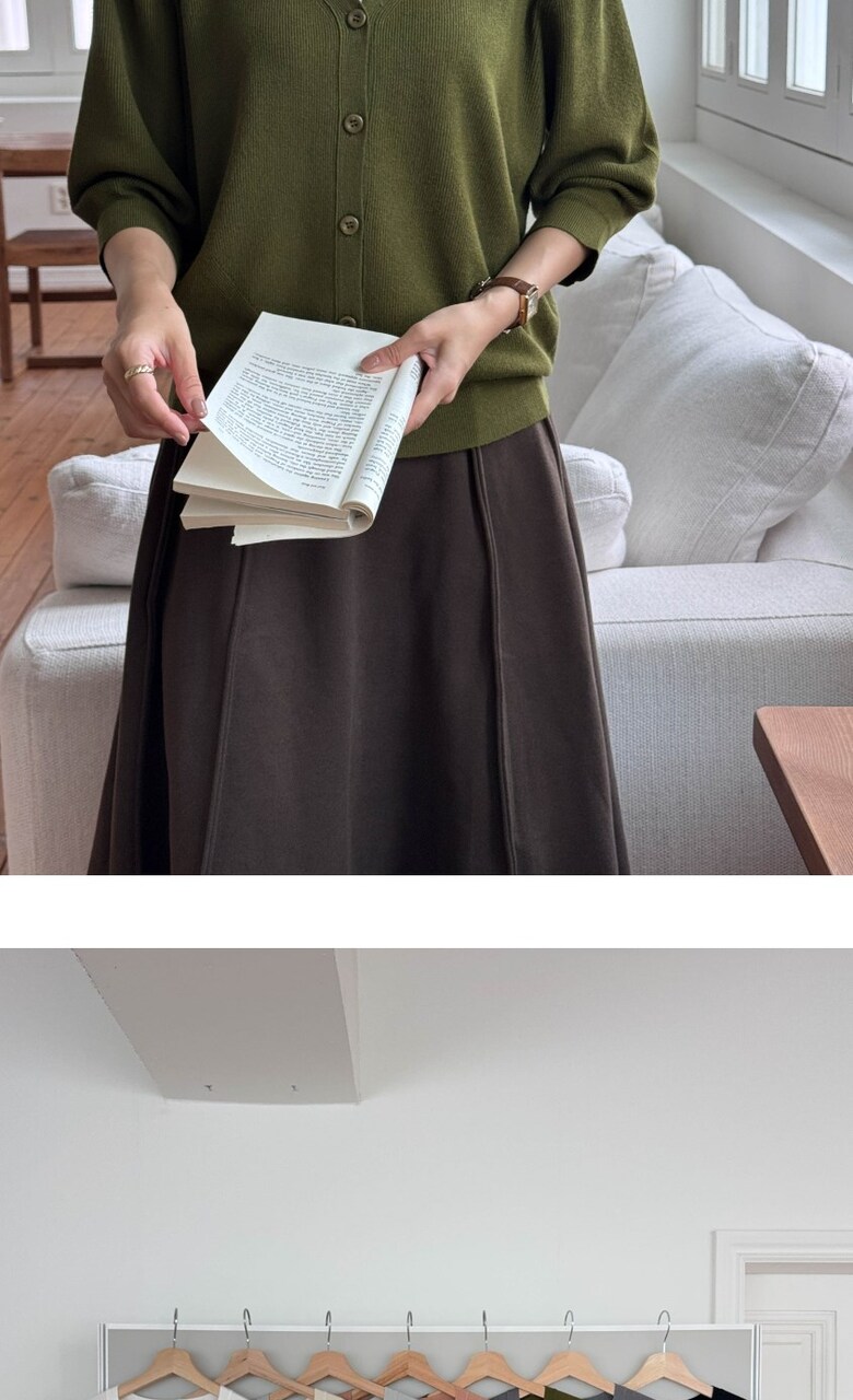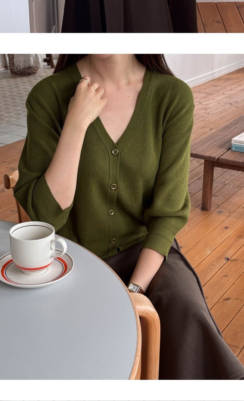 차분한 카키 브이넥 가디건 담백한 감성의 데일리 니트룩