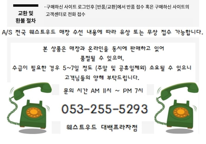 A/S 책임자와 전화번호 : AS 및 기타 문의 사항은 해당 매장 [김진곤,053-255-5293] 으로 전화주시면 감사하겠습니다.