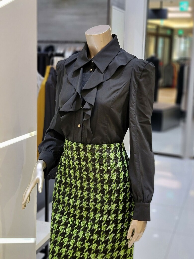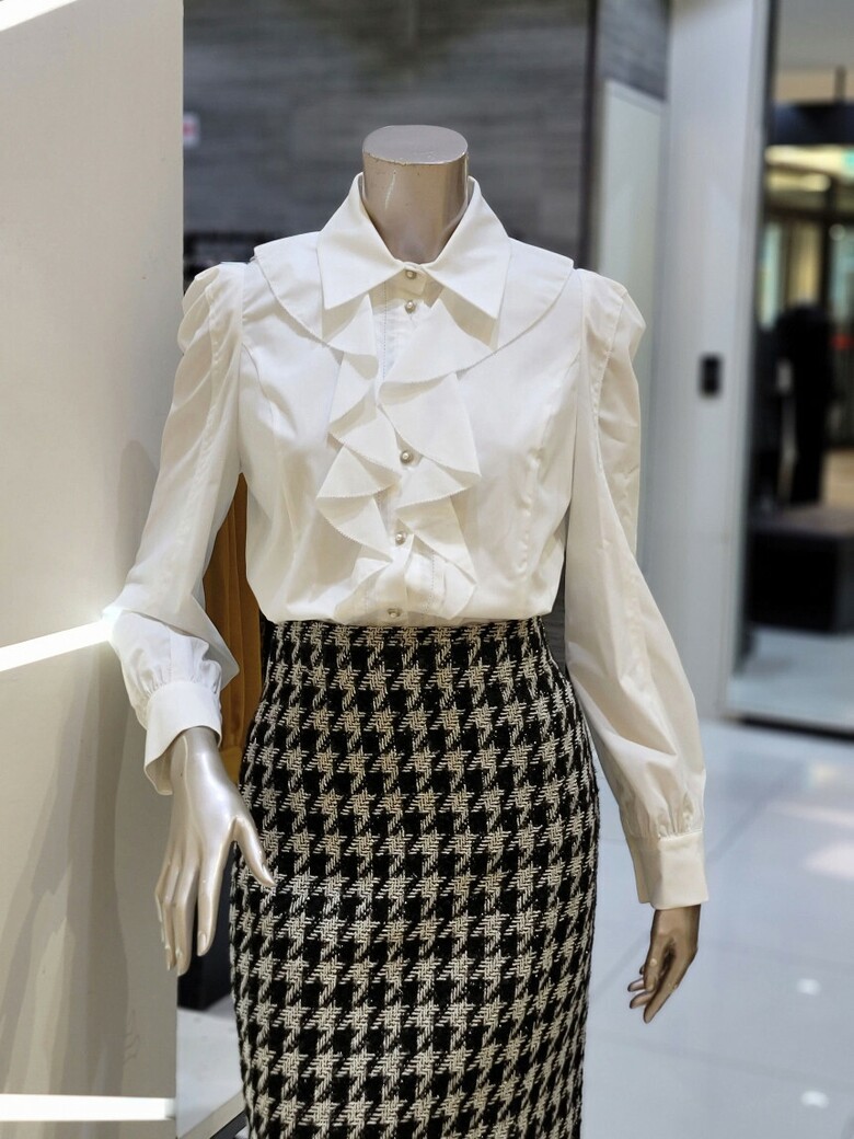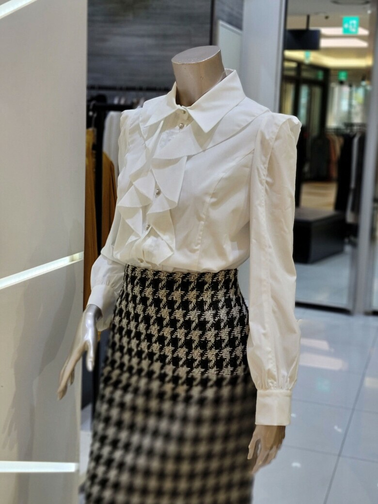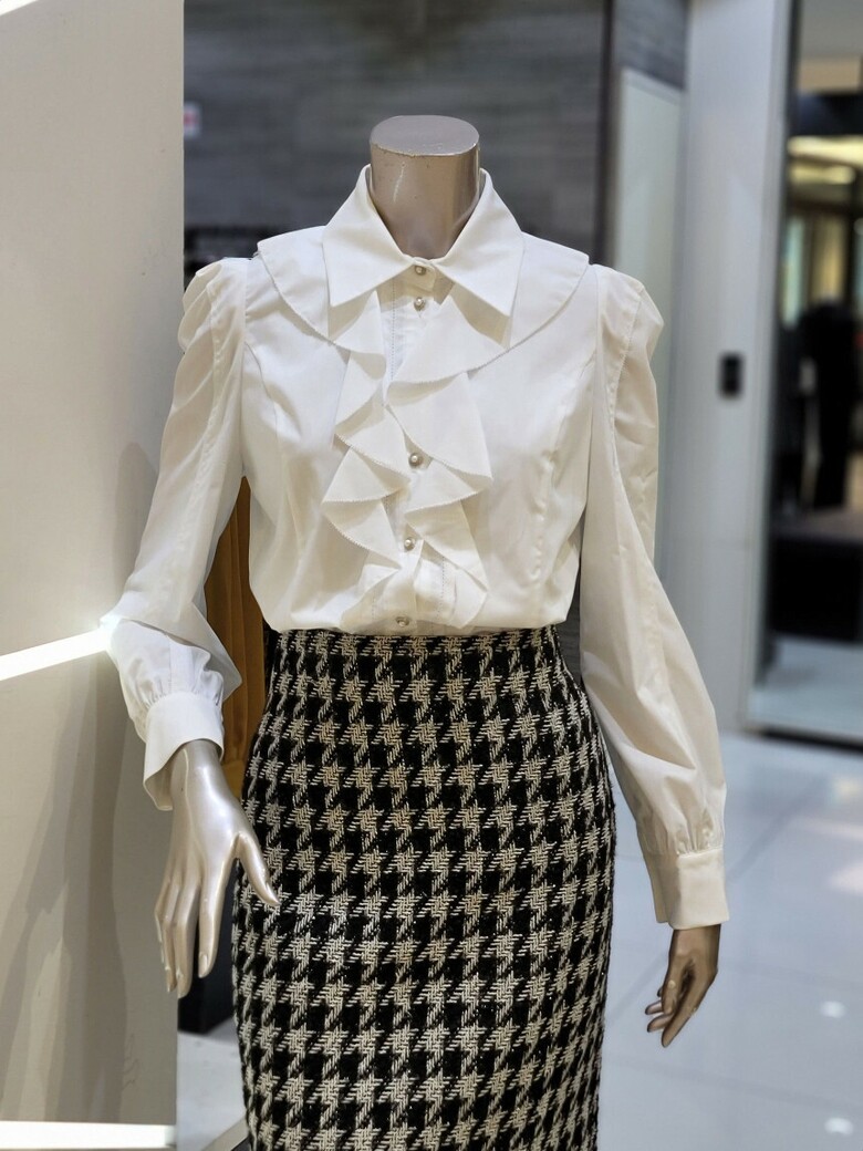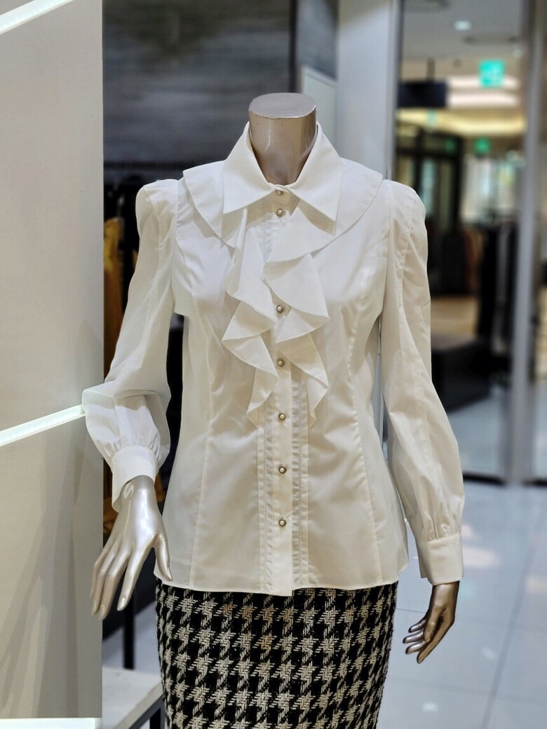 칼라 넥 라인에 프런트 러플 장식 디테일로