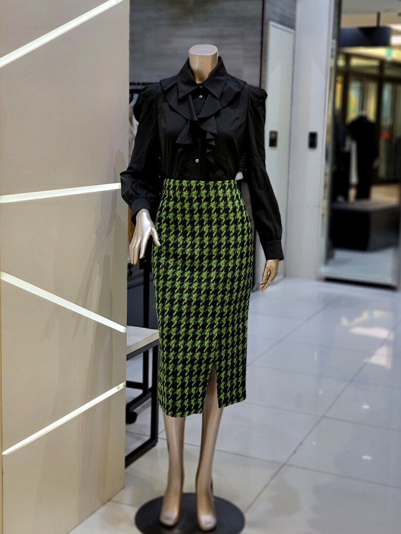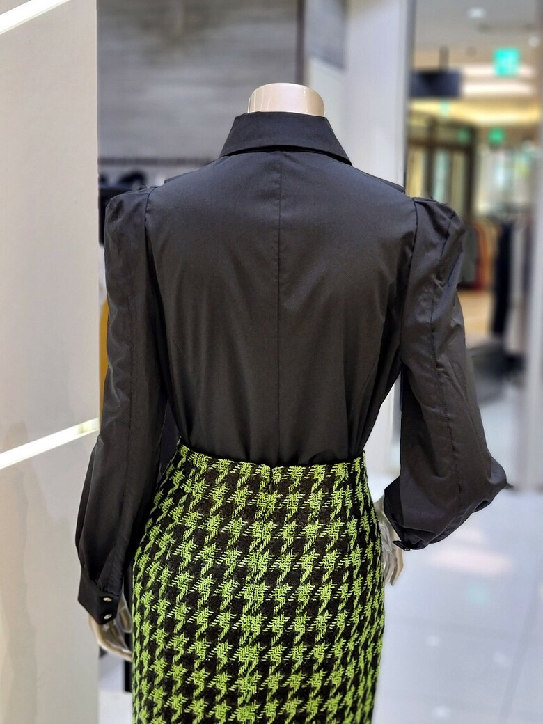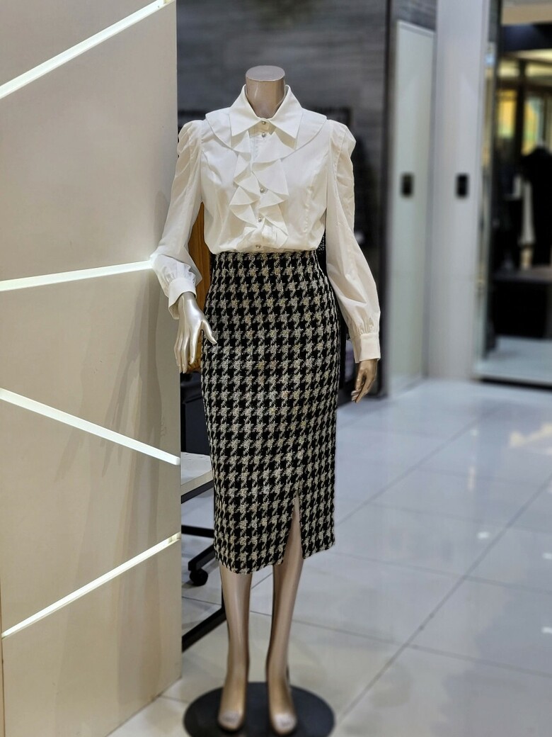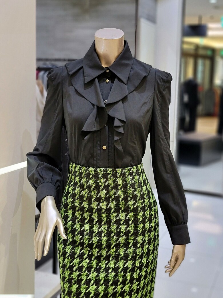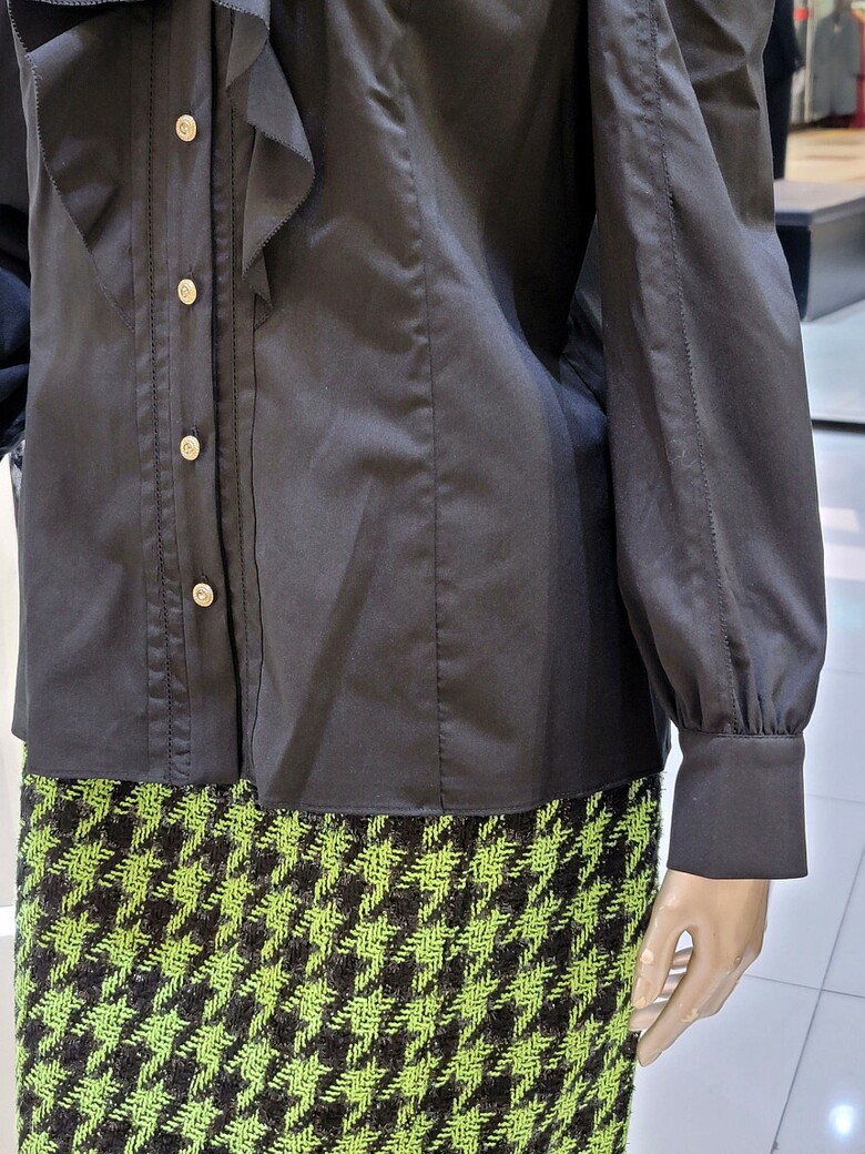 칼라 넥 라인에 프런트 러플 장식 디테일로