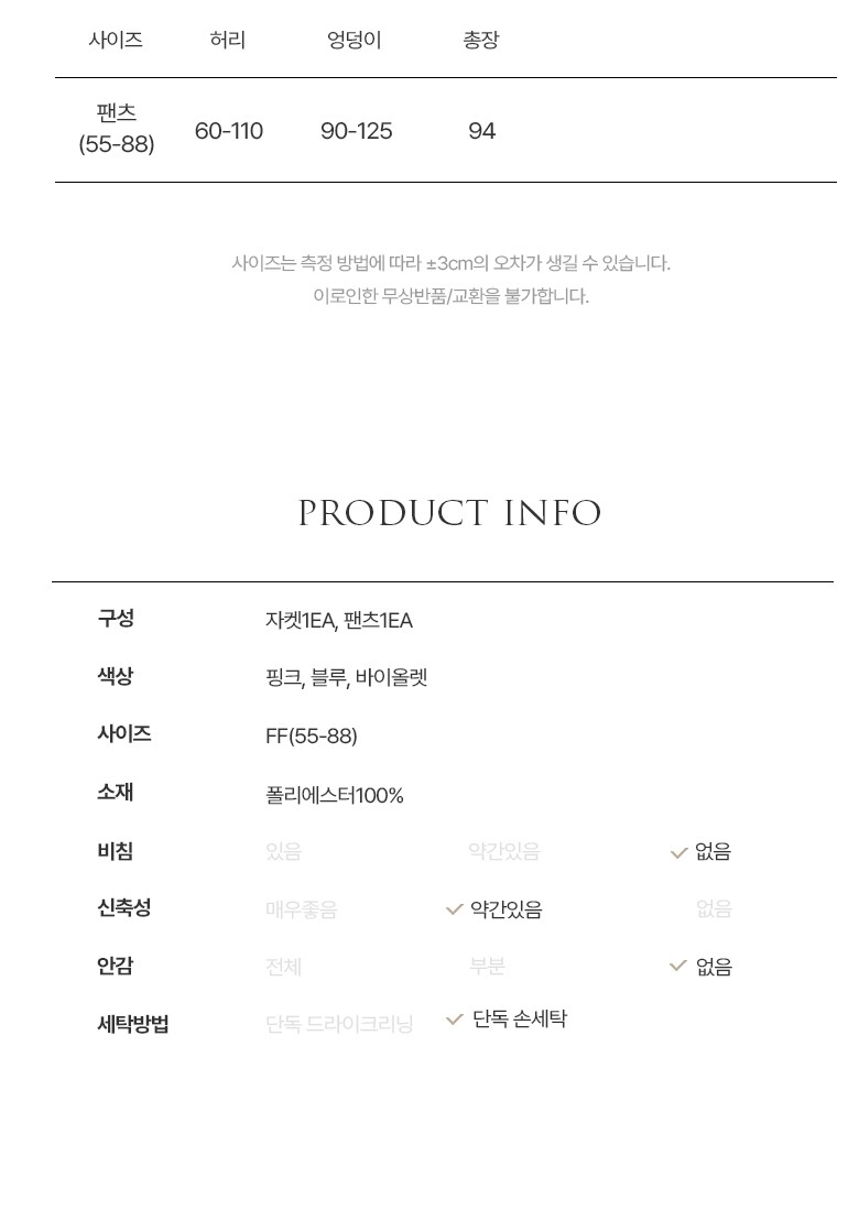 | 1. 제품 소재 (섬유의 조성 또는 혼용률을 백분율로 표시, 기능성인 경우 성적서 또는 허가서) | 폴리에스터100% |