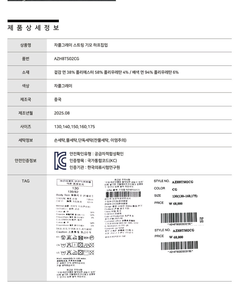 | 1. 제품 소재 (섬유의 조성 또는 혼용률을 백분율로 표시, 기능성인 경우 성적서 또는 허가서) | 겉감 면 38% 폴리에스터 58% 폴리우레탄 4% / 배색 면 94% 폴리우레탄 6% |