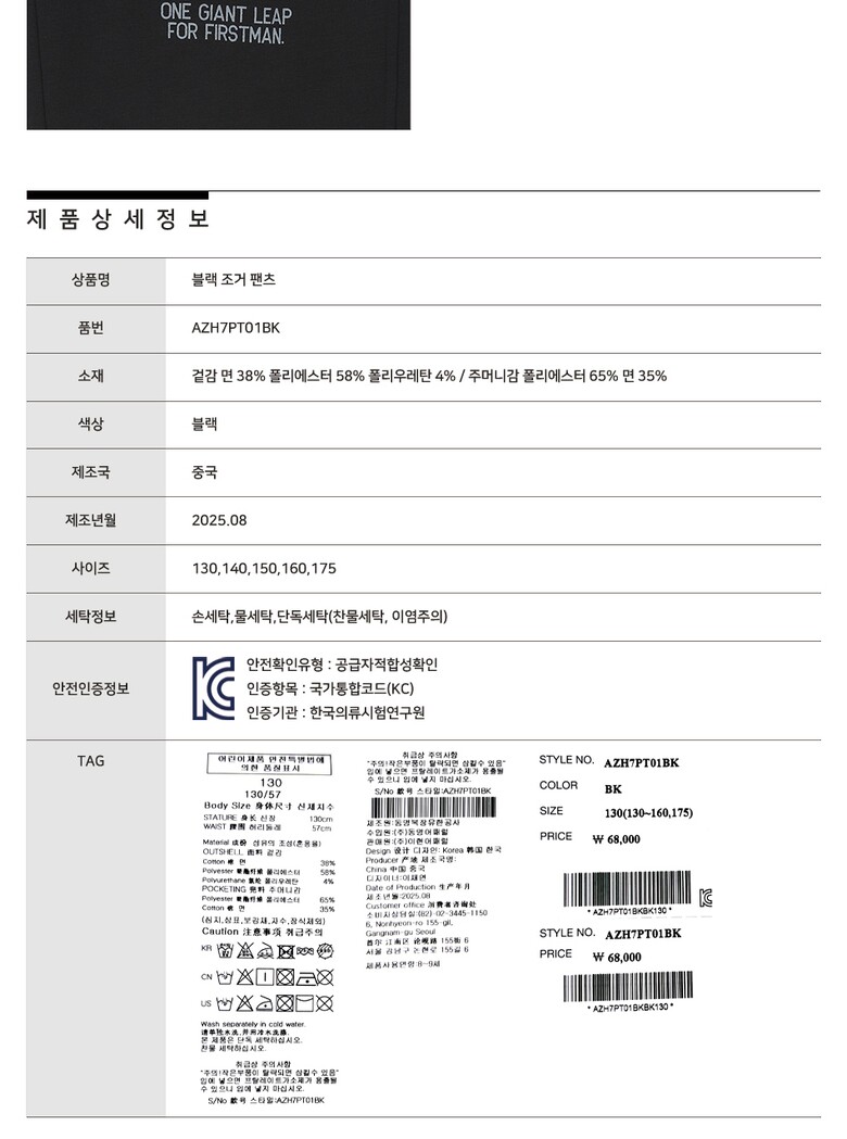 제품소재 : 겉감 면 38% 폴리에스터 58% 폴리우레탄 4% / 주머니감 폴리에스터 65% 면 35%