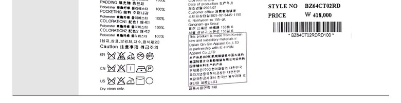 제품소재 : 겉감 양털 81% 알파카 10% 나일론 9% / 안감, 충전재, 주머니감, 배색 폴리에스터 100%