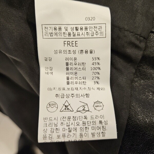 제품소재 : 겉감-레이온55%, 폴리우레탄45%, 안감-폴리에스터100%, 배색-레이온70%, 폴리에스터27%, 폴리우레탄3%