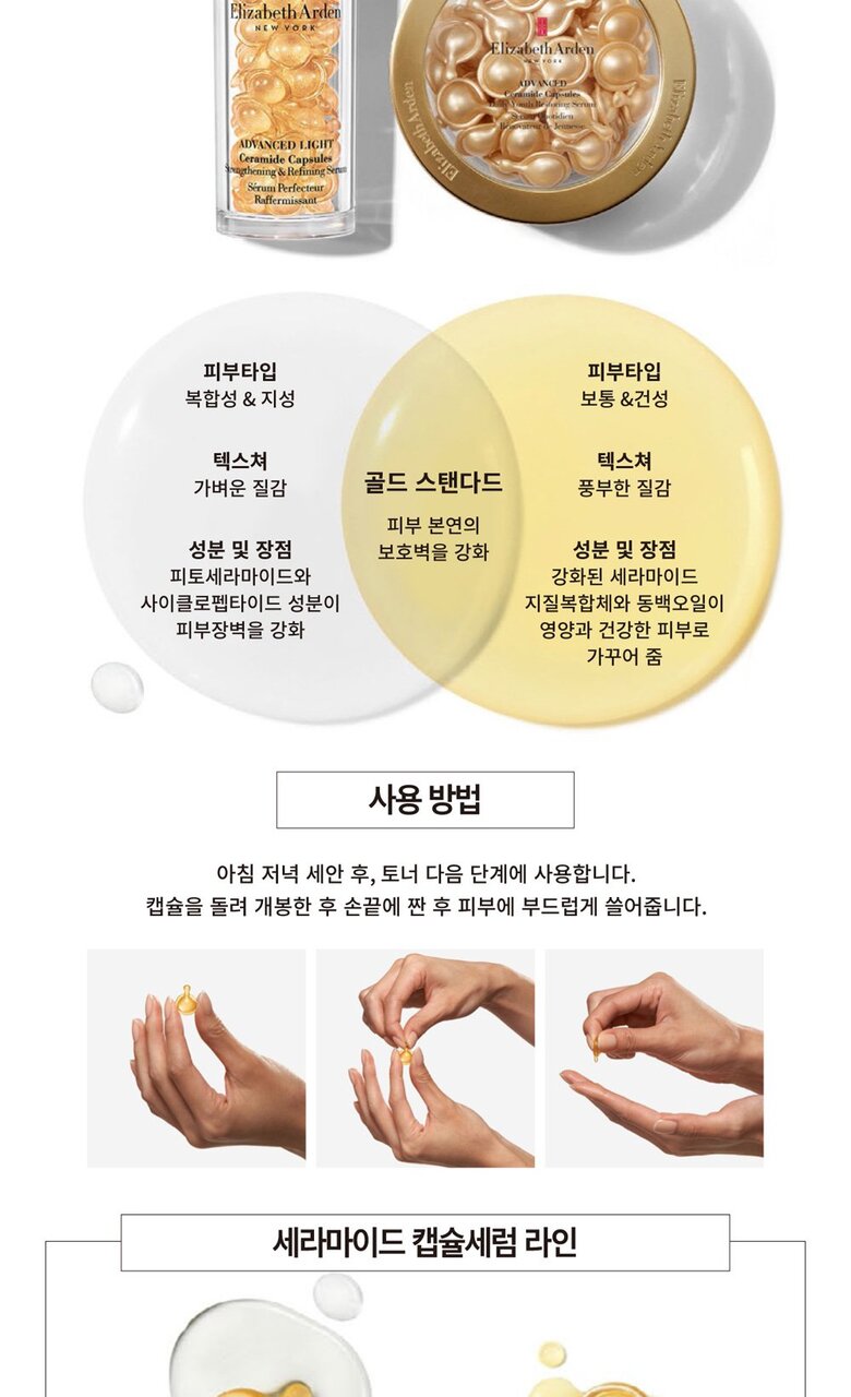4. 사용방법 | 부드럽게 꼭지를 두번 돌려서 캡슐을 오픈하세요. 세안을 마친 얼굴과 목에 모이스춰라이저 단계 이전에 매일 아침(라이트캡슐), 저녁(라이트캡슐 또는 레티놀캡슐)마다 발라주세요. |