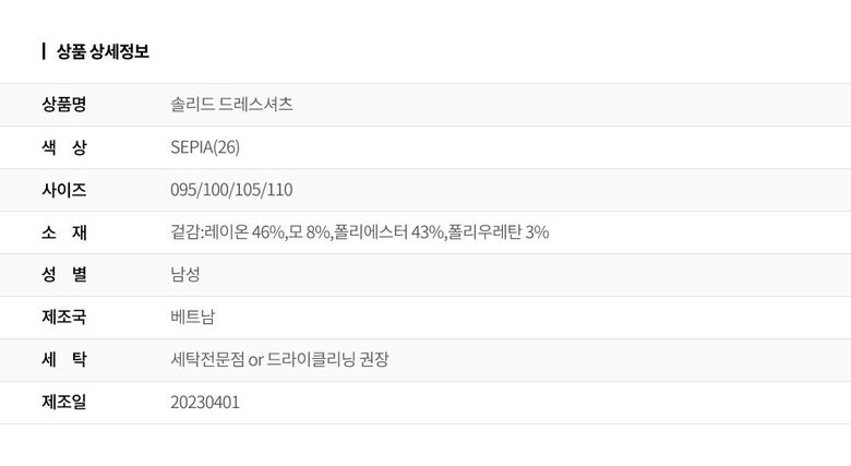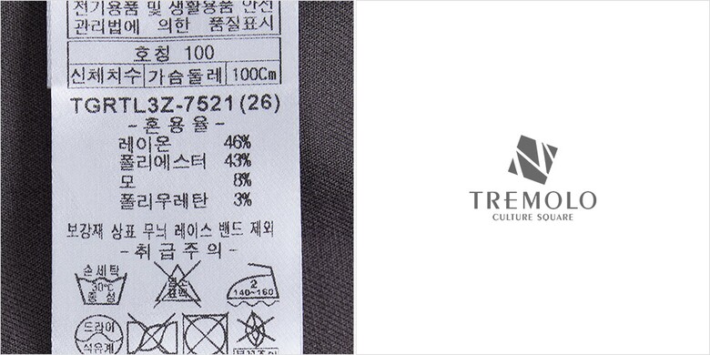 제품소재 : 레이온46%, 폴리에스터43%, 모8%, 폴리우레탄3%