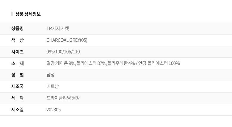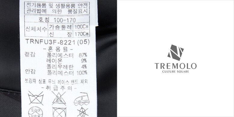 제품소재 : 겉감 폴리에스터87%, 레이온9%, 폴리우레탄4%