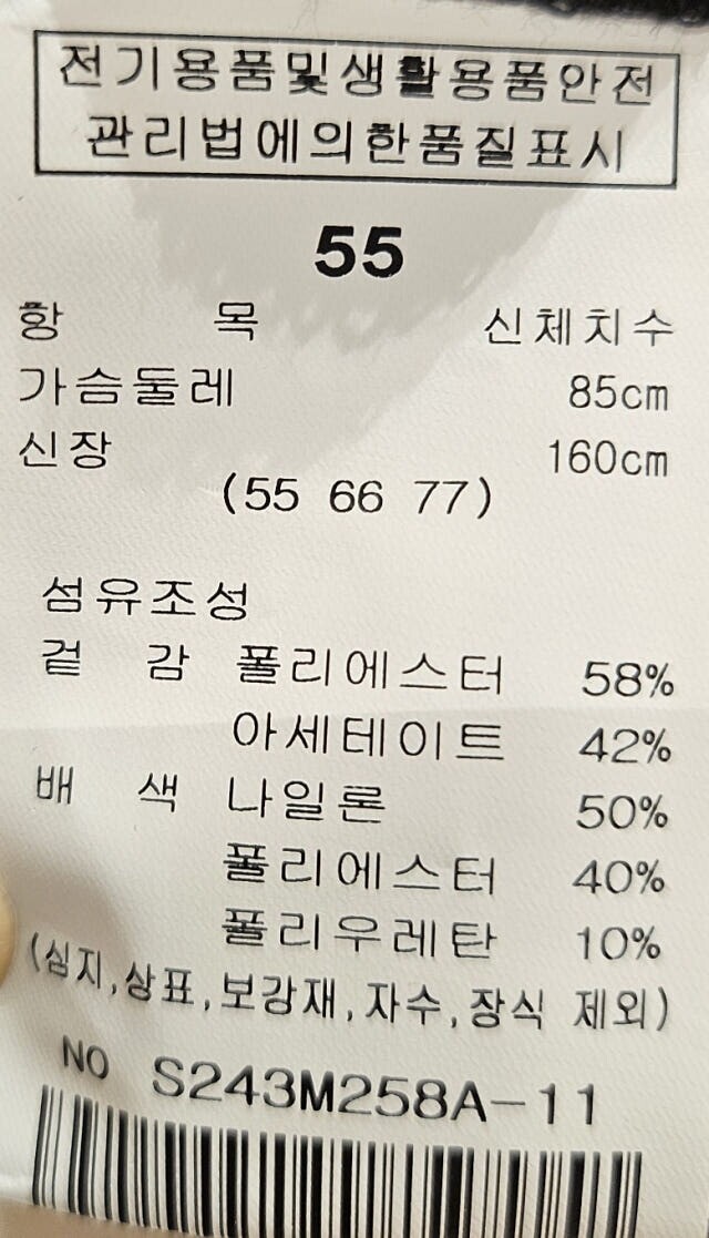 | 1. 제품 소재 (섬유의 조성 또는 혼용률을 백분율로 표시, 기능성인 경우 성적서 또는 허가서) | 상품상세참조 |