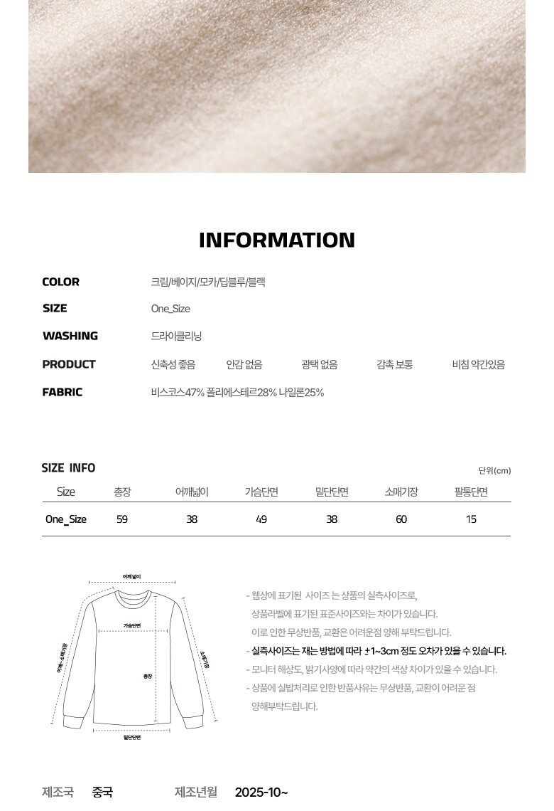 1. 제품 소재 (섬유의 조성 또는 혼용률을 백분율로 표시, 기능성인 경우 성적서 또는 허가서) | 비스코스47% 폴리에스테르28% 나일론25% |