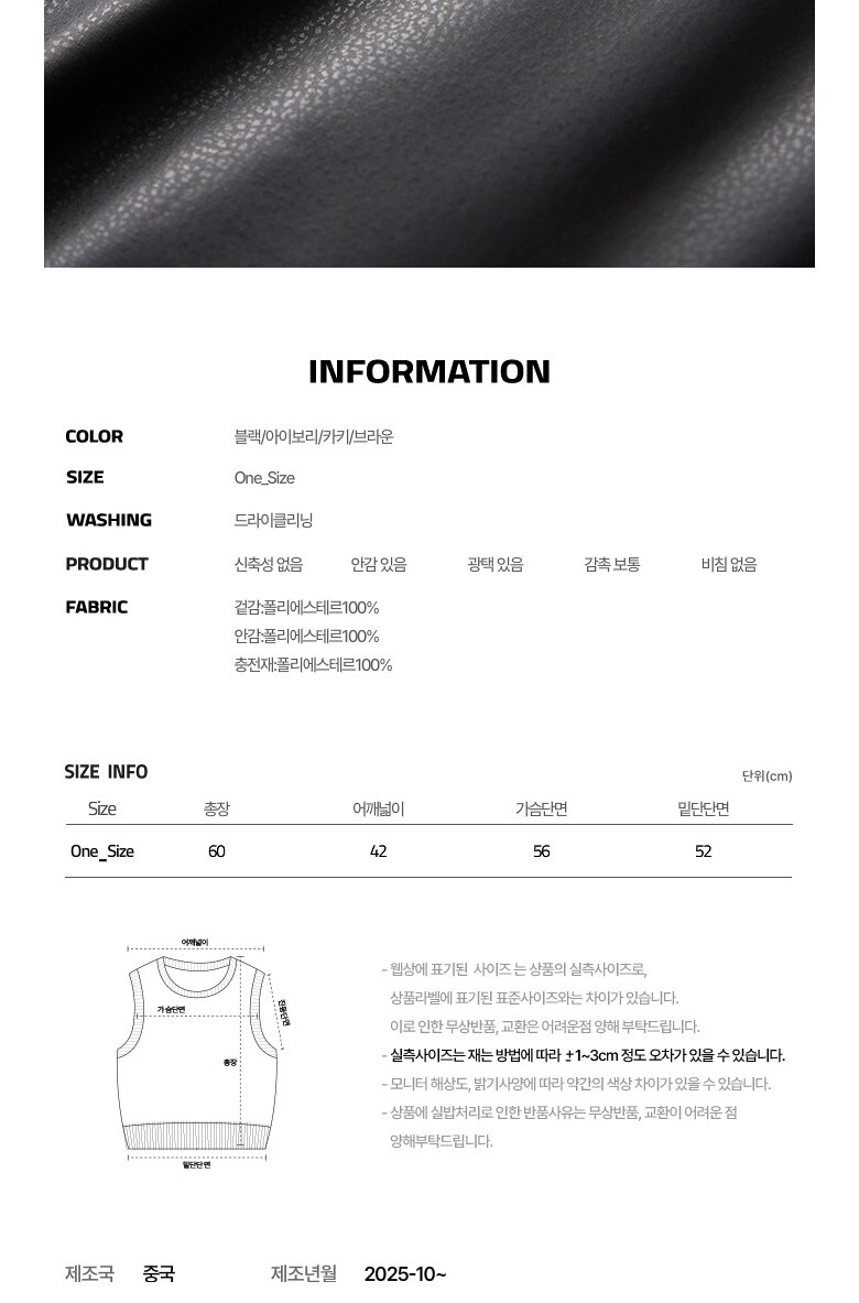 • 처음 배송된 상품상태와 다를 경우(세탁/착용 후 외출하신 경우) 반품이 불가합니다.