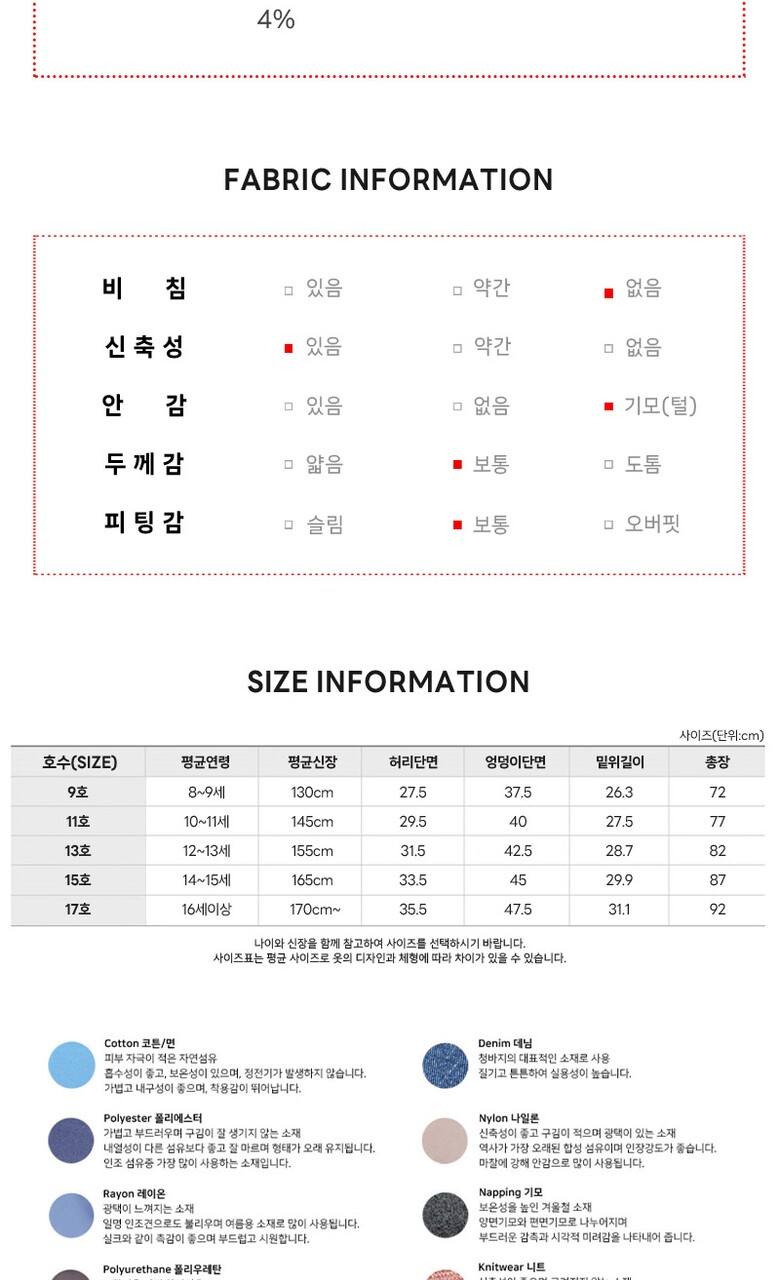 | 1. 제품 소재 (섬유의 조성 또는 혼용률을 백분율로 표시, 기능성인 경우 성적서 또는 허가서) | 겉감:폴리에스터68% 레이온28% 폴리우레탄4% |