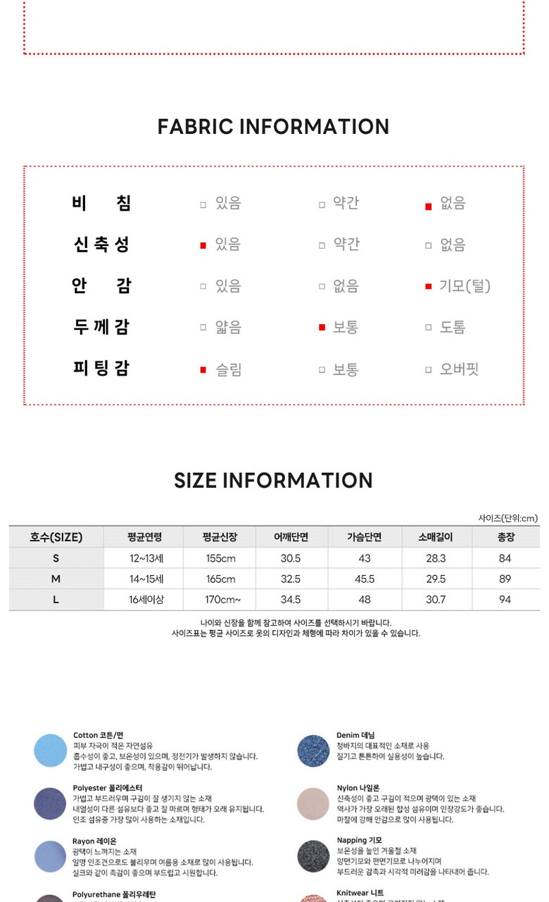 1. 제품 소재 (섬유의 조성 또는 혼용률을 백분율로 표시, 기능성인 경우 성적서 또는 허가서) 겉감:폴리에스터95% 폴리우레탄5%