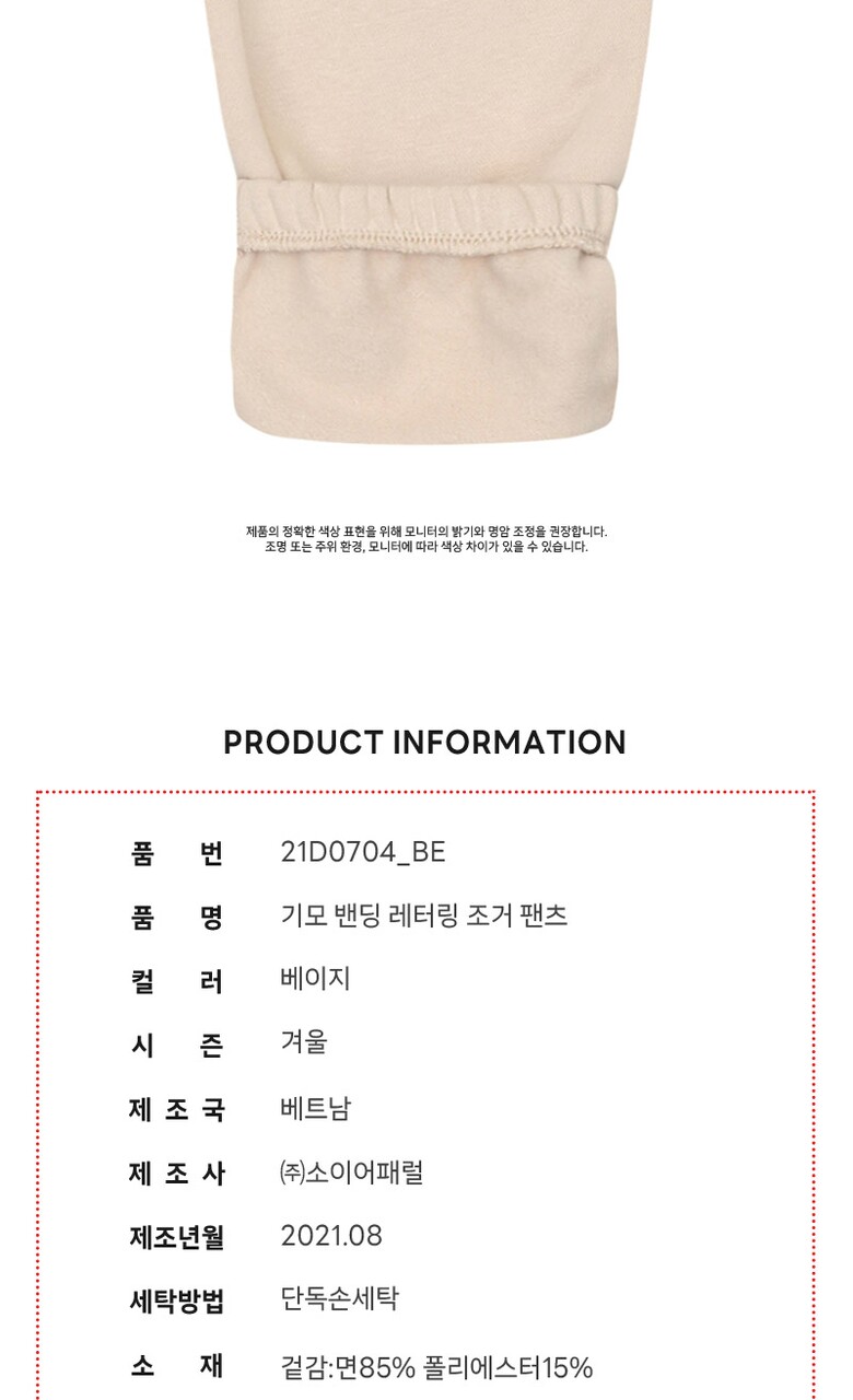 1. 제품 소재 (섬유의 조성 또는 혼용률을 백분율로 표시, 기능성인 경우 성적서 또는 허가서) 겉감:면85% 폴리에스터15%