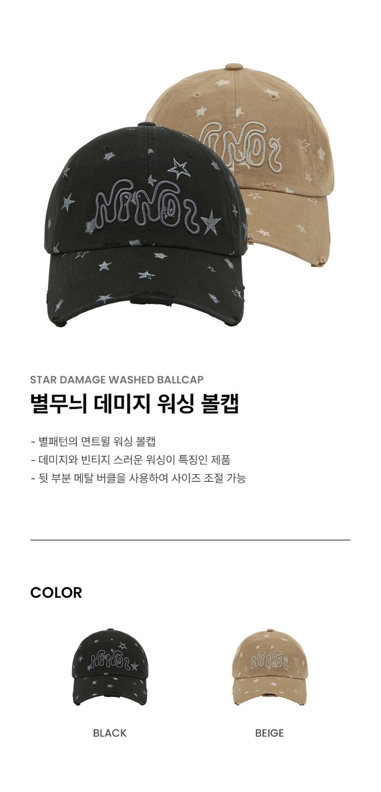 꼬모니노즈 [CN]STAR DAMAGE WASHED BALLCAP (WW9N3TIAC107)