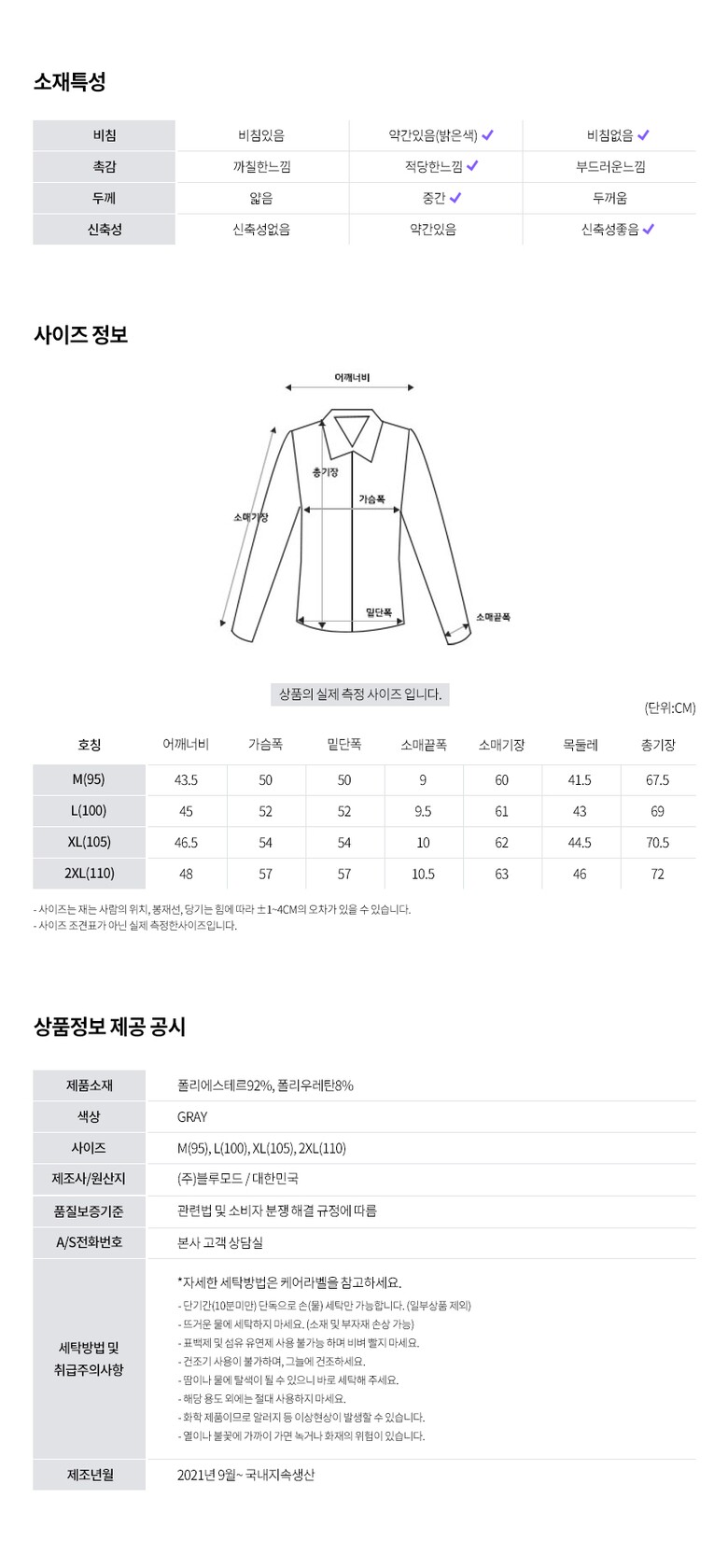 1. 제품 소재 (섬유의 조성 또는 혼용률을 백분율로 표시, 기능성인 경우 성적서 또는 허가서) 상품 이미지 참고