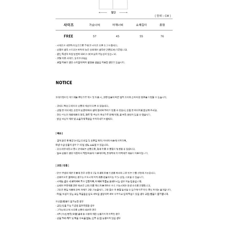 • 처음 배송된 상품상태와 다를 경우(세탁/착용 후 외출하신 경우) 반품이 불가합니다.