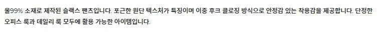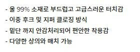 | 1. 제품 소재 (섬유의 조성 또는 혼용률을 백분율로 표시, 기능성인 경우 성적서 또는 허가서) | 상품상세참조 |