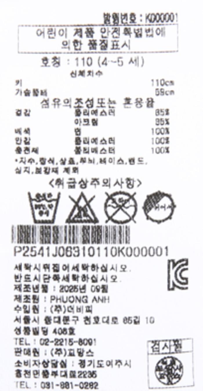 제품소재 : 폴리에스터 65% 아크릴 35%