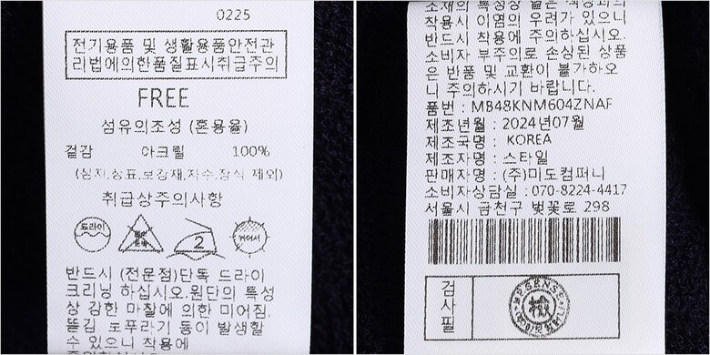 | 1. 제품 소재 (섬유의 조성 또는 혼용률을 백분율로 표시, 기능성인 경우 성적서 또는 허가서) | 겉감-아크릴100% |