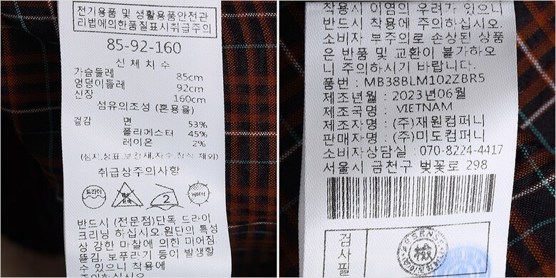 | 1. 제품 소재 (섬유의 조성 또는 혼용률을 백분율로 표시, 기능성인 경우 성적서 또는 허가서) | 겉감-면53% 폴리에스터45% 레이온2% |