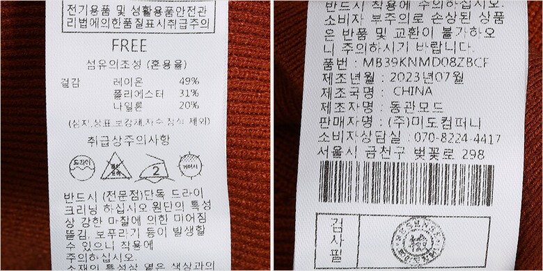 1. 제품 소재 (섬유의 조성 또는 혼용률을 백분율로 표시, 기능성인 경우 성적서 또는 허가서) 겉감-폴리에스터31% 나일론20% 레이온49%