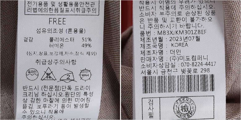 | 1. 제품 소재 (섬유의 조성 또는 혼용률을 백분율로 표시, 기능성인 경우 성적서 또는 허가서) | 겉감-폴리에스터51% 레이온49% |